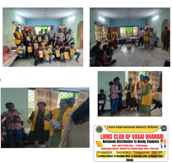 President Lion Nancy Pereira, along with her dedicated Bharari team, brightened the lives of children at Snehasadan Ashram, Rashmi Park, Waliv, Vasai East. They distributed notebooks and snacks, demonstrating that education and kindness go hand-in-hand, and further cementing the club’s enduring commitment to the welfare of the less-privileged.