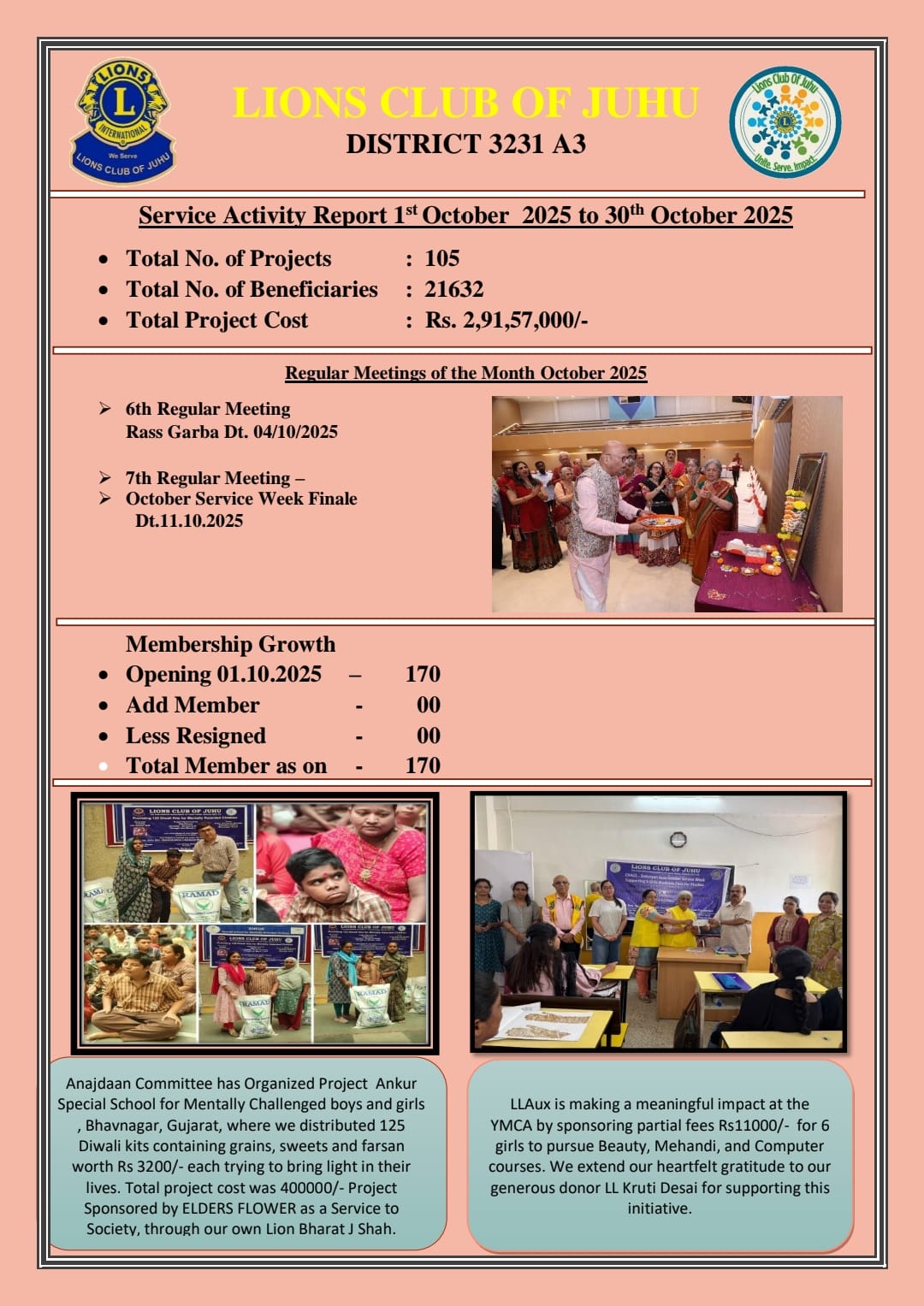 Appreciation Award Grow to Serve given by international Director Lion Dato Yeow Wah Chin – 2024-26 ( From Malaysia ) & his wife, Dist. Governer Lion Manoj Babur, 1st & 2nd VDG & Dist. Cabinet Team to – Lion Manju Somani President & her Team of Lions Club of (Bombay) Yoginagar for Service Project – Donation of 100 Packets of Anaj Dan given to old age home at Karjat & Malad & Free Medical Check up camp at RG2 Garden, at Yoginagar. Borivali (west), Mumbai-92.