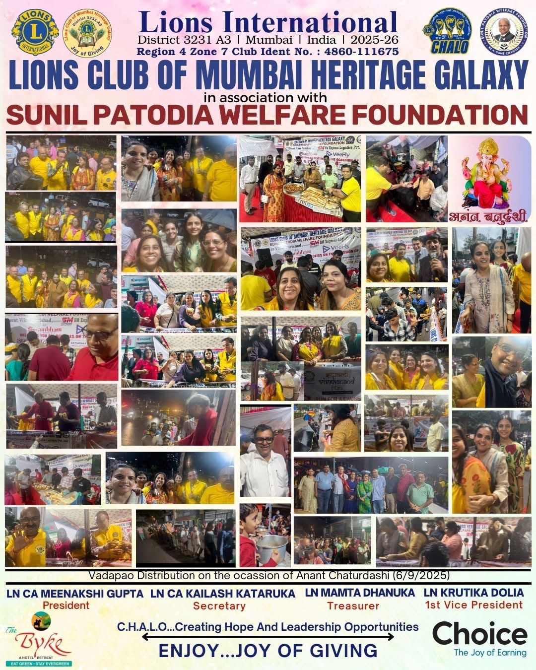 Like every year, the Lions Club of Mumbai Heritage Galaxy, in association with the Sunil Patodia Welfare Foundation, distributed Vadapav to Ganesh Bhakts on Anant Chaturdashi. The event fostered community spirit, bringing joy and gratitude to all.