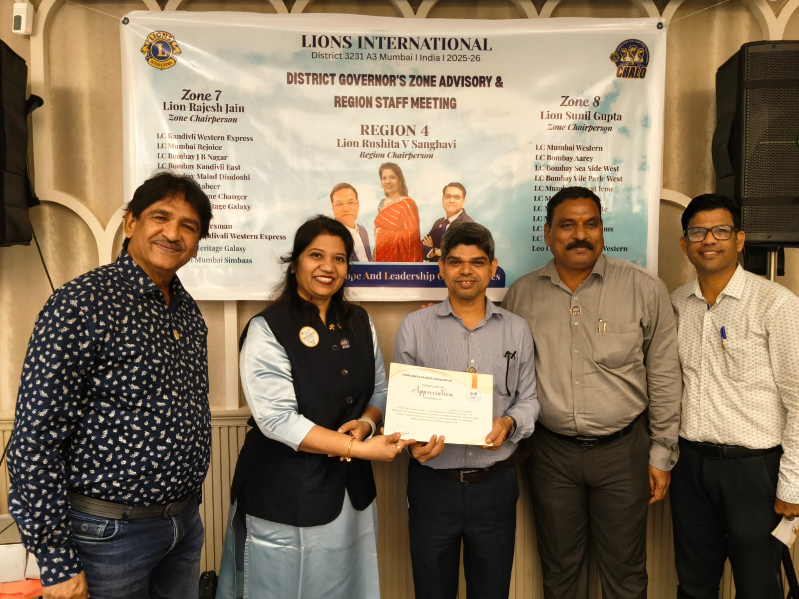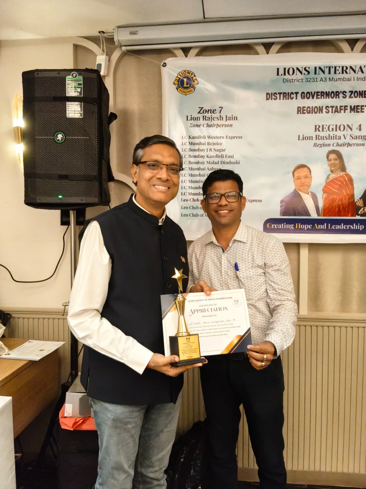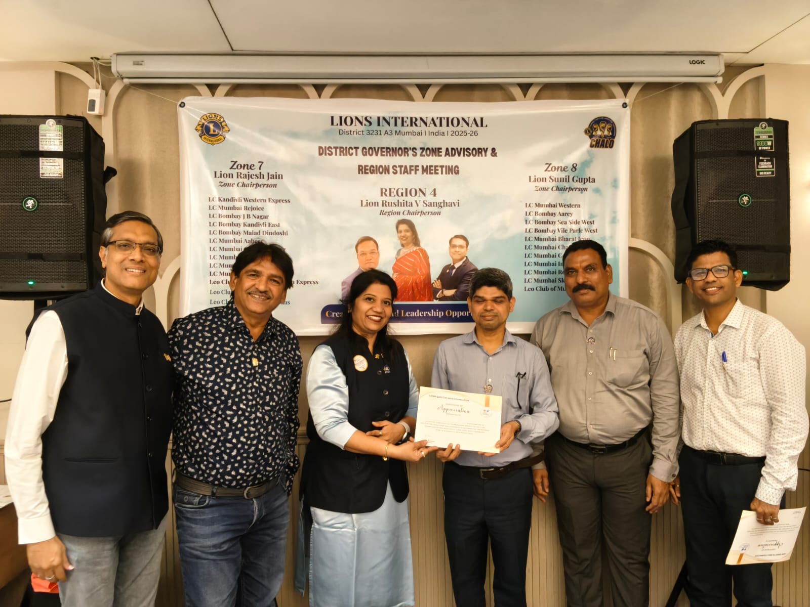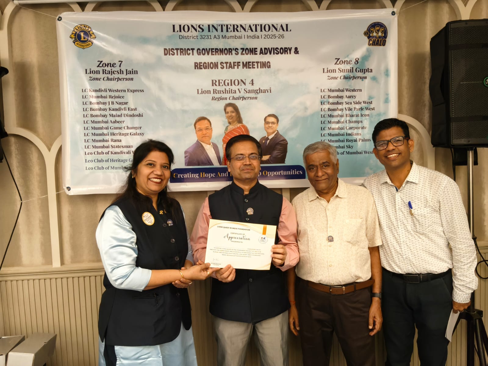 Lions Clubs from Kandivali Western Express, Mumbai Rejoice, Mumbai Statesman, Bombay Seaside West, Bombay Kandivali East, Bombay Aarey, Mumbai Heritage Galaxy, Mumbai Rana, Mumbai Western, and Bombay Vile Parle West were honored with Quest Awards during the 1st Zone Advisory and Region Meet. Both the Region Chairperson and Zone Chairperson also received the prestigious Quest Award.